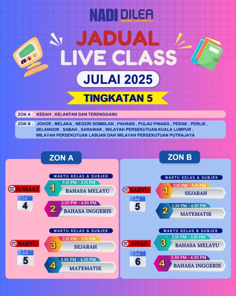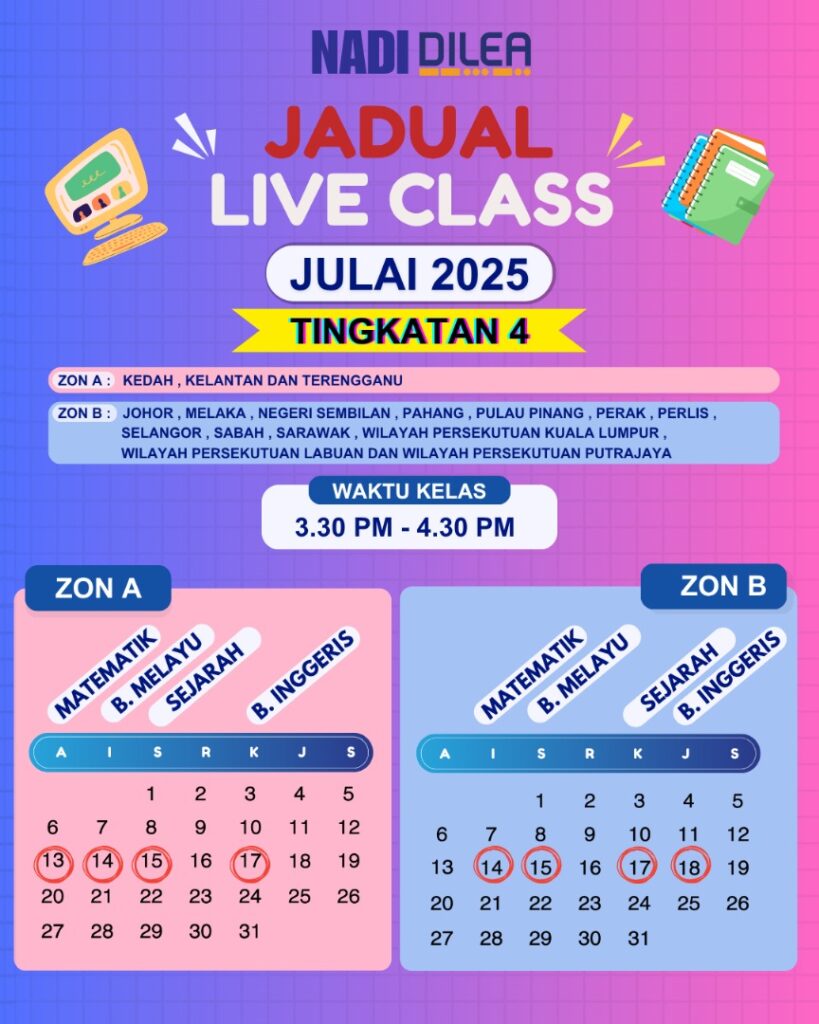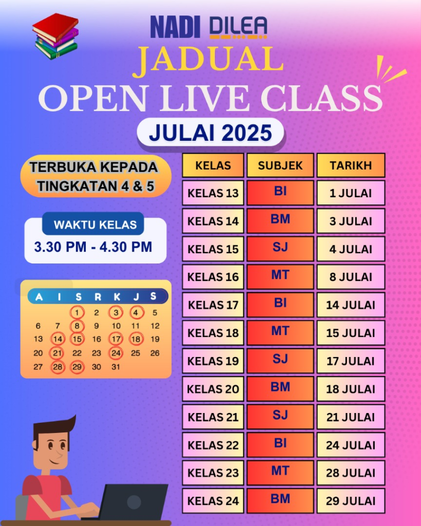 Merujuk kepada makluman terdahulu berkenaan pelaksanaan sesi OPEN LIVE CLASS DILEA yang bermula pada Jun 2025, sukacita dimaklumkan bahawa sesi ini akan diteruskan bagi bulan Julai 2025.