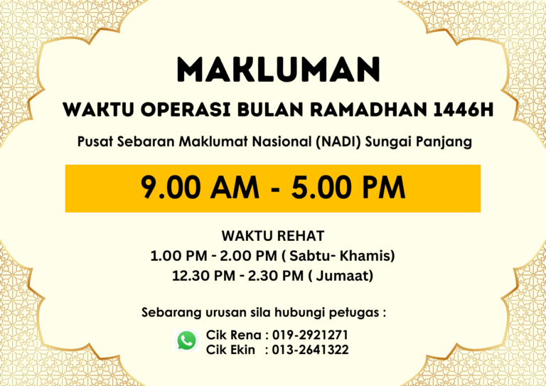 Assalamualaikum & Salam Sejahtera Sempena kehadiran bulan Ramadan 1447H/2026M yang dijangka pada 19 Februari 2026 (Khamis), berikut adalah waktu operasi serta waktu bekerja petugas NADI sepanjang bulan ramadan mengikut garis panduan operasi NADI yang ditetapkan oleh MCMC: