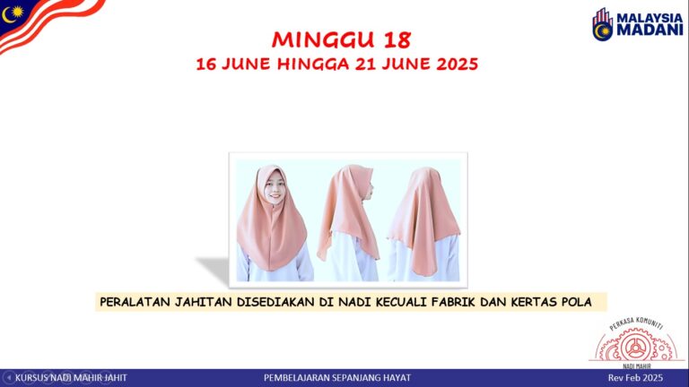 Tarikh : 16 Jun 2025 Masa : 9.30 am β 11.30 am Lokasi : NADI Sungai Panjang Peserta : 2 orang Tujuan Menjahit tudung dan kelas recap Aktiviti Aktiviti-aktiviti:β Cara menjahit tudung dua lapisβ Kelas recap […]